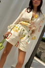 Questo set è composto da una blusa ampia con chiusura a bottone e pantaloni corti a vita alta coordinati. È realizzato in tessuto leggero e traspirante e presenta una stampa audace ed eclettica. Il taglio oversize e i dettagli vivaci lo rendono la combinazione perfetta di comfort e dichiarazione di moda. Abbinalo a sandali eleganti o mule appariscenti per un look vacanziero senza sforzo e cool.