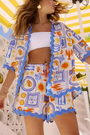 Entrate in un sogno mediterraneo con il Set Lilly. Realizzato in tessuto leggero e traspirante, questo vivace set a due pezzi è composto da una camicia button-up ampia e da pantaloni shorts a vita alta abbinati, decorati con stampe giocose e solari in vivaci tonalità di blu e agrumi. L'orlo ondulato conferisce un tocco femminile e giocoso, rendendo questo set perfetto per vacanze estive e brunch su terrazze.